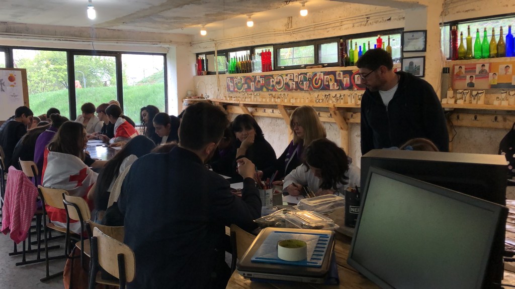 Ապրիլի 12-ին հյուրընկալեցինք Վրաստանից ժամանած հյուրերին: Հյուրերին ներկայացրեցինք Ոսկեգործական լաբորատորիայի բոլոր անկյունները: Ծանոթացրեցինք դասավանդման ոսկեգործական մեթոդին, որը արդյունավետ է նույնիսկ 4-րդ դասարանի սովորողի համար: Հարցերից և պատասխաններից հետո իրագործեցինք փորձնական, ոսկեգործական դիզայնի առաջին փուլի դաս: Դասի ժամանակ, կոմիտասի երաժշտության ներքո 20 հոգանոց խմբի տարատարիք մասնակիցները պատկերեցին թղթի վրա իրենց երևակայության մեջ նշմարվող զարդերի էսքիզները: Օրինակ բերվեց և ցուցադրվեց, թե ինչպես կարող է այդ էսքիզը վերածվել իրական ոսկեգործական իրի: